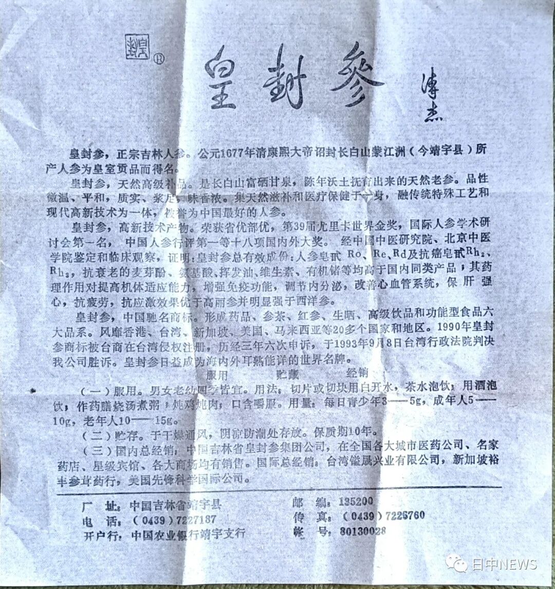 皇封参,正宗吉林人参。公元1677年清康熙大帝诏封长白山蒙江洲(今靖宇县)所产人参为皇室贡品而得名。皇封参,天然高级补品。是长白山富硒甘泉,陈年沃土抚育出来的天然老参。品性微温、平和,质实、浆尼,味香浓。集天然滋补和医疗保健于一身,融传统特殊工艺和现代高新技术为一体,被誉为中国最好的人参。皇封参,高新技术产物。荣获省优部优,第39届尤里卡世界金奖,国际人参学术研讨会第一名,中国人参行评第一等十八项国内外大奖。经中国中医研究院、北京中医学院鉴定和临床观察,证明:皇封参总有效成份:人参皂甙Ro、Re、Rd及抗癌皂Rh.. Rh:,抗衰老的麦芽酚、氨基酸、挥发油、维生素、有机锗等均高于国内同类产品;其药理作用对提高机体适应能力,增强免疫功能,调节内分泌,改善心血管系统,保肝强心,抗疲劳,抗应激效果优于高丽参并明显强于西洋参。皇封参,中国驰名商标。形成药品、参茶、红参、生晒、高级饮品和功能型食品六大品系。风摩香港、台湾、新加坡、美国、马来西亚等20多个国家和地区。1990年皇封参商标被台商在台湾侵权注册,历经三年六次申诉,于1993年9月8日台湾行政法院判决我公司胜诉。皇封参日益成为海内外耳熟能详的世界名牌。